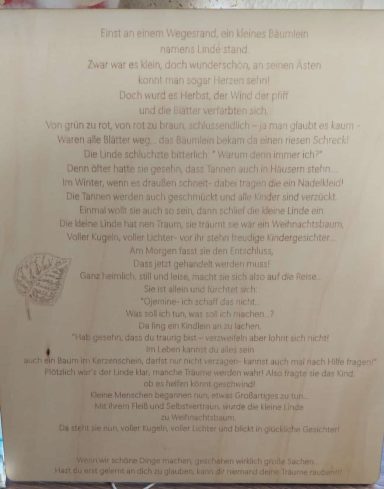 Am Sonntag, dem 1.12.2024 war es soweit: Der 3. Oberndorfer Advents Kalender Wander Weg (AKWW) wurde eröffnet, und zwar auf einem neuen rund 3 km langen Rundweg, der auch für Kinderwagen geeignet ist. Der Verein war mit einer speziellen Weihnachtslinde und einer winterlichen Geschichte über eine kleine Linde dabei.
