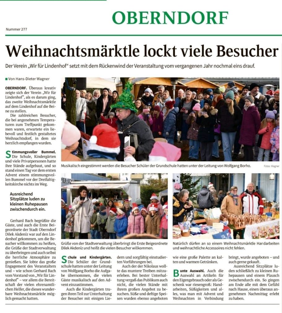 - Am 29.11.2025 war es wieder mal soweit. Das zweite Lindenhofer Weihnachtsmärktle fand wieder auf dem Treffpunkt statt. Das Wetter, die ganze Woche eher verregnet, verbesserte sich gerade noch rechtzeitig. Wir konnten uns über ein sehr gut besuchtes, stimmungsvolles und vor allem perfekt organisiertes Ereignis freuen.